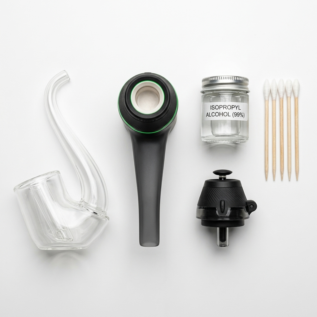 Before you start, collect everything you need: isopropyl alcohol (91% concentration or higher), cotton swabs (pointed-tip swabs work best for small chambers), a sealable plastic bag or small glass container, paper towels, and a pipe cleaner for the glass airpath. Isopropyl alcohol at 91% or higher concentration dissolves concentrate residue significantly faster than 70% formulations, often breaking down fresh buildup in under five minutes of soaking.